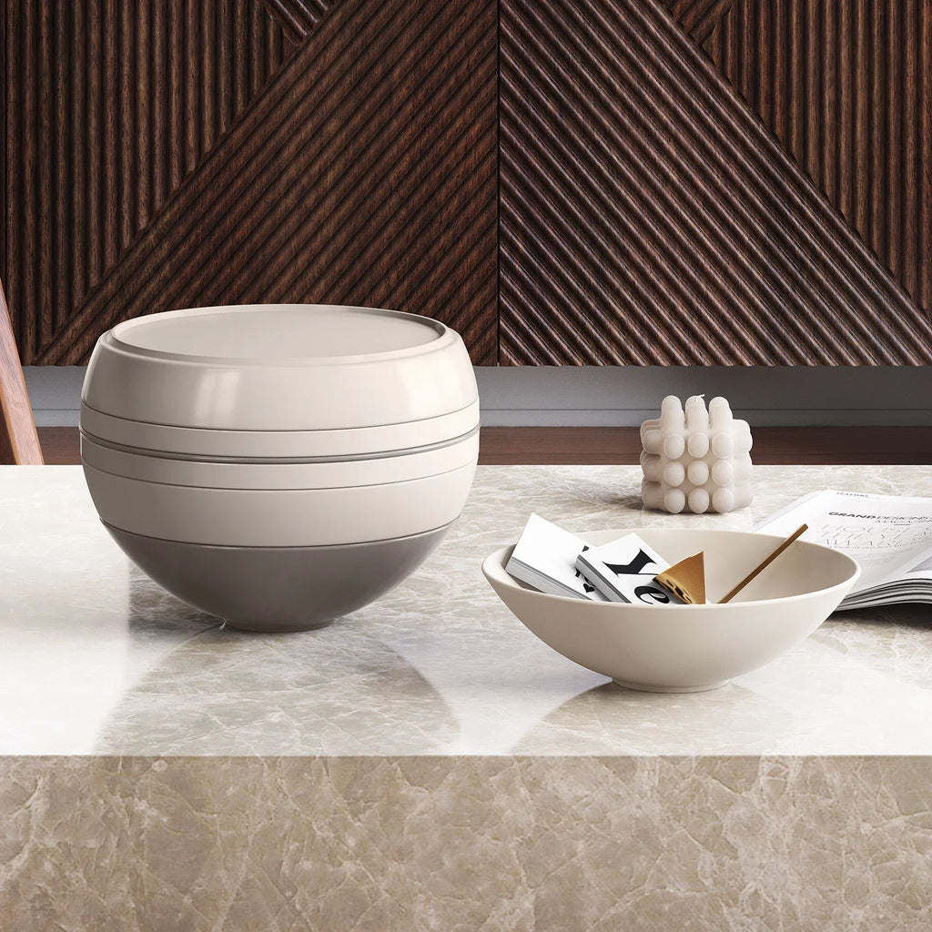 A esfera La Boule é um conjunto de artigos de porcelana de qualidade premium concebidos para duas pessoas. Dois pratos planos, dois pratos universais, duas saladeiras e uma travessa se conectam magicamente e aparecem na forma de uma bola.
