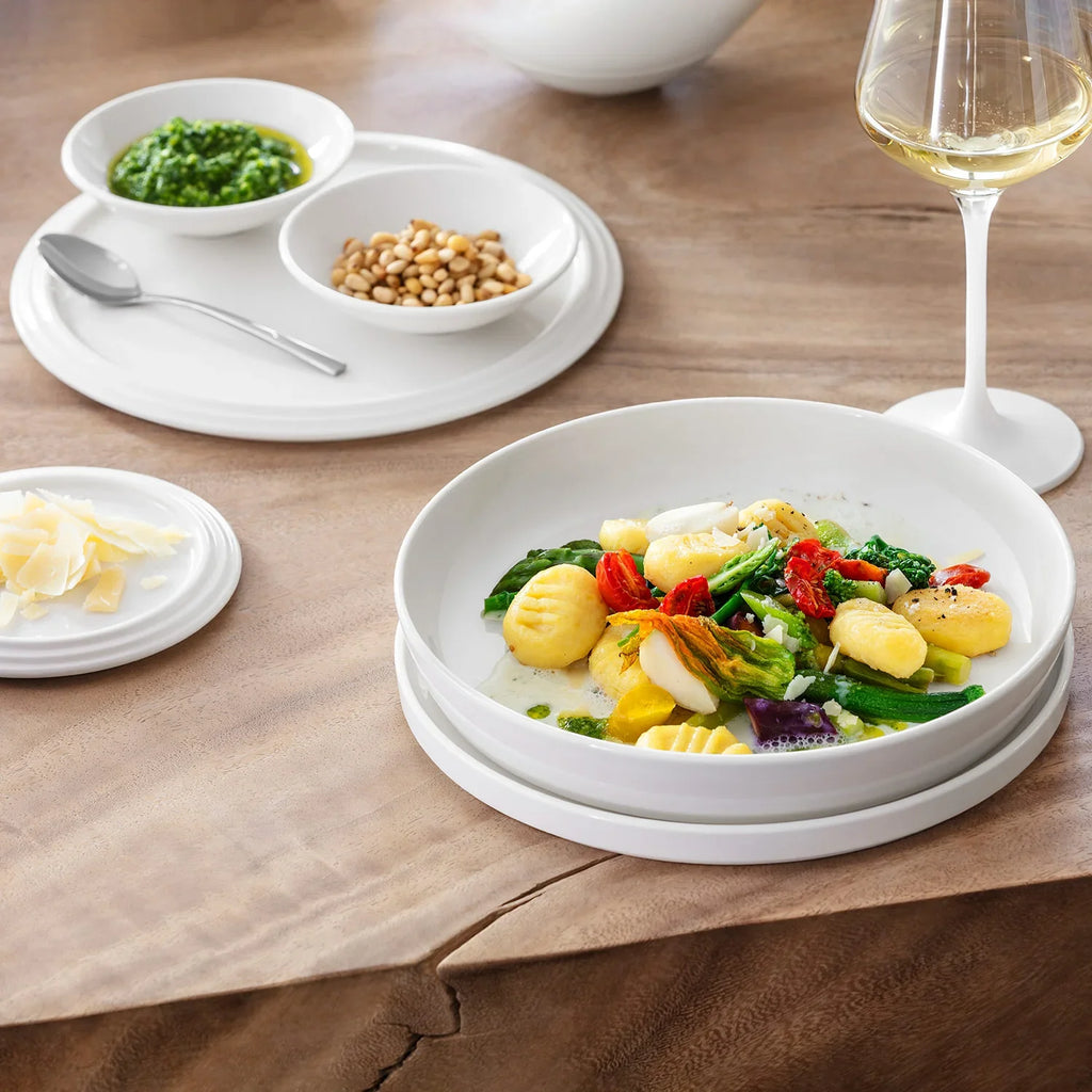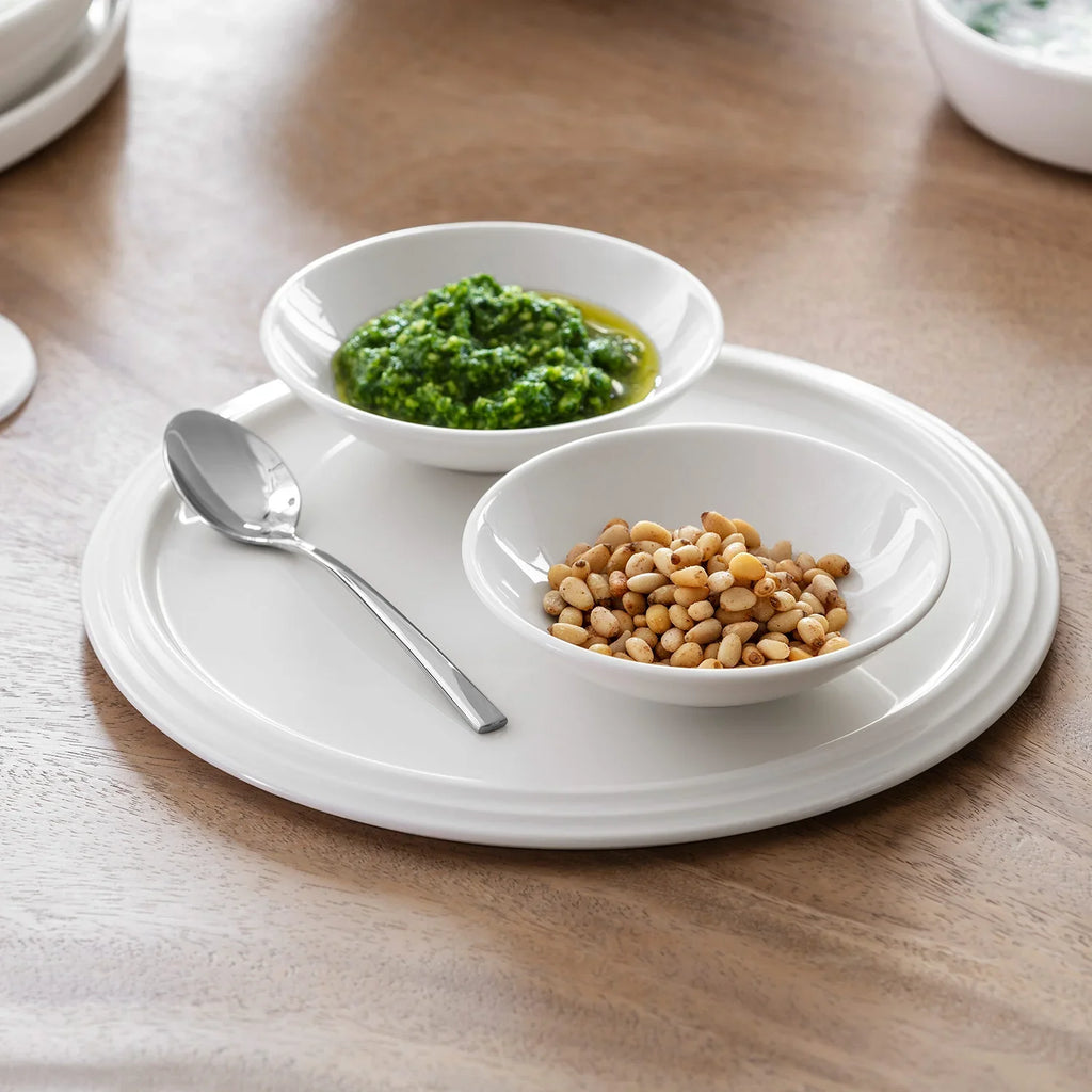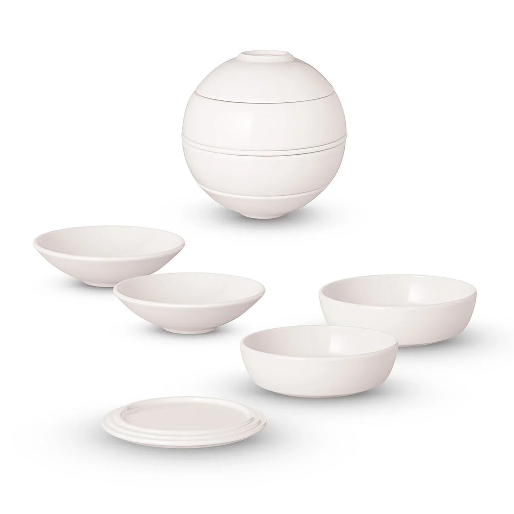 A esfera La Boule é um conjunto de artigos de porcelana de qualidade premium concebidos para duas pessoas. Dois pratos planos, dois pratos universais, duas saladeiras e uma travessa se conectam magicamente e aparecem na forma de uma bola.