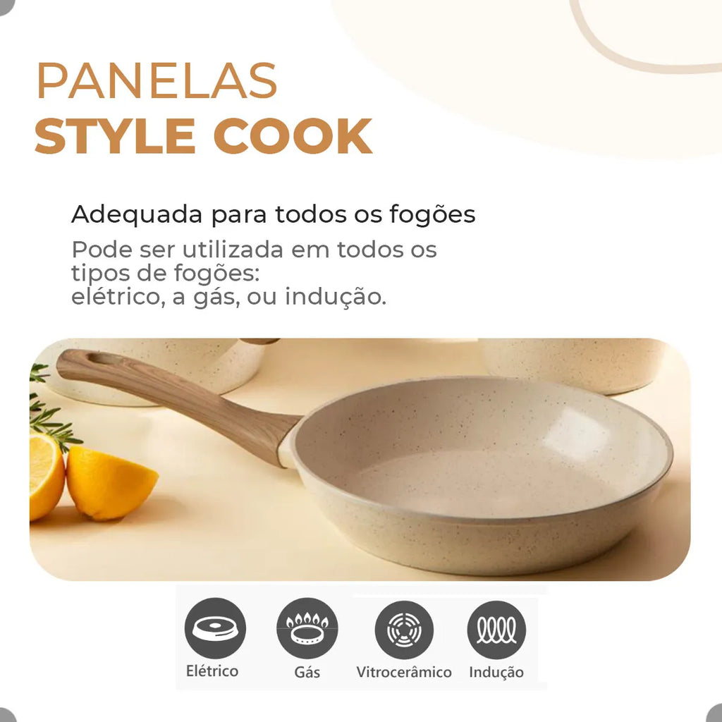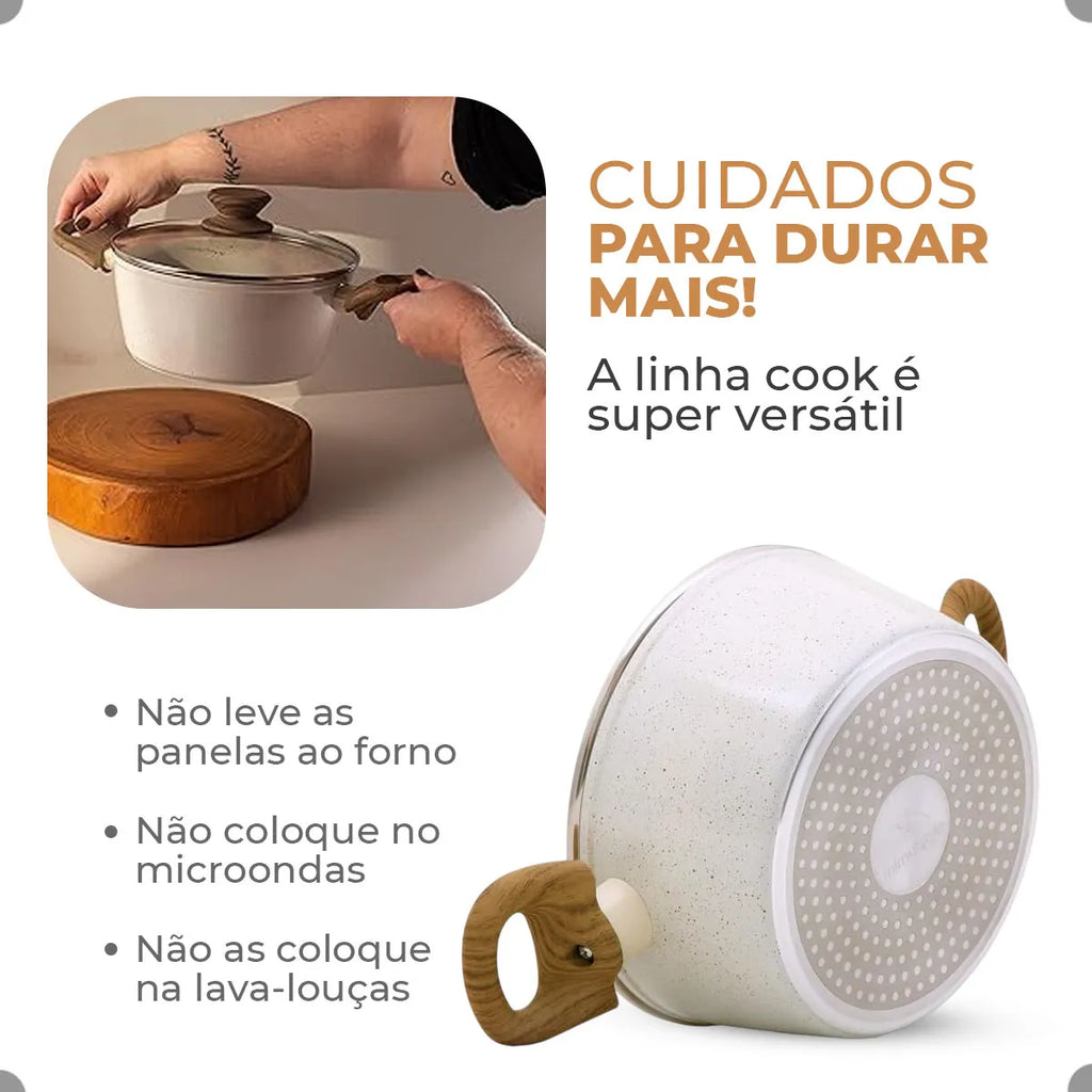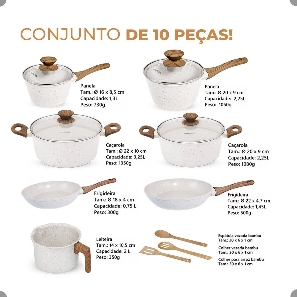 Dê um toque de sofisticação à sua cozinha com o Conjunto de Panelas Style Cook. Elegância, praticidade e tecnologia se unem em um produto ideal para tornar suas experiências culinárias ainda mais agradáveis e eficientes. CARACTERÍSTICAS Revestimento Cerâmico: Superfície interna e externa antiaderente que facilita o preparo dos alimentos e a limpeza. Fundo de Indução: Compatível com fogões elétricos, a gás, vitrocerâmicos e de indução. Cabos de Baquelite com Revestimento Soft-Touch: Oferecem conforto, segurança e proteção contra chamas. Tampas de Vidro Temperado com Saída de Vapor: Permitem visualizar o preparo sem perda de calor. Espessura de 3 mm: Garantia de resistência e distribuição uniforme de calor. BENEFÍCIOS Praticidade no Dia a Dia: Ideal para preparar uma ampla variedade de pratos com rapidez e facilidade. Durabilidade e Elegância: Materiais de alta qualidade que combinam estilo com resistência. Versatilidade: Adequado para diversos tipos de fogões e perfeito para uso diário ou ocasiões especiais. Economia de Tempo: A antiaderência reduz o uso de óleo e facilita a limpeza, deixando mais tempo para o que realmente importa. ESPECIFICAÇÕES Material: Alumínio com revestimento cerâmico, baquelite, inox e vidro temperado. Dimensões e Capacidades: Caçarola 1: 34 cm x 22 cm x 14 cm - 3,5L Caçarola 2: 36 cm x 20 cm x 15,5 cm - 1,9L Panela 1: 37,5 cm x 20 cm x 14,5 cm - 2,05L Panela 2: 33,5 cm x 16 cm x 13,5 cm - 1,3L Frigideira 1: 38 cm x 22 cm x 8 cm - 1,2L Frigideira 2: 37,5 cm x 18 cm x 6 cm - 0,9L Leiteira: 19,5 cm x 14 cm x 12 cm - 1,5L Colher de Arroz: 30 cm x 6 cm x 1 cm Colher Vazada: 30 cm x 6 cm x 1 cm Espátula: 30 cm x 6 cm x 1 cm Espessura: 3 mm Cor: Marmol Marca: Mimo Style INMETRO: 003005/2022 LISTA DE EMBALAGEM 2 Caçarolas com Tampas 2 Panelas com Tampas 2 Frigideiras 1 Leiteira 1 Colher de Arroz 1 Colher Vazada 1 Espátula Transforme sua cozinha com o Conjunto de Panelas Style Cook, que alia funcionalidade, resistência e design sofisticado para suas receitas diárias ou ocasiões especiais. É o toque final que sua cozinha merece!