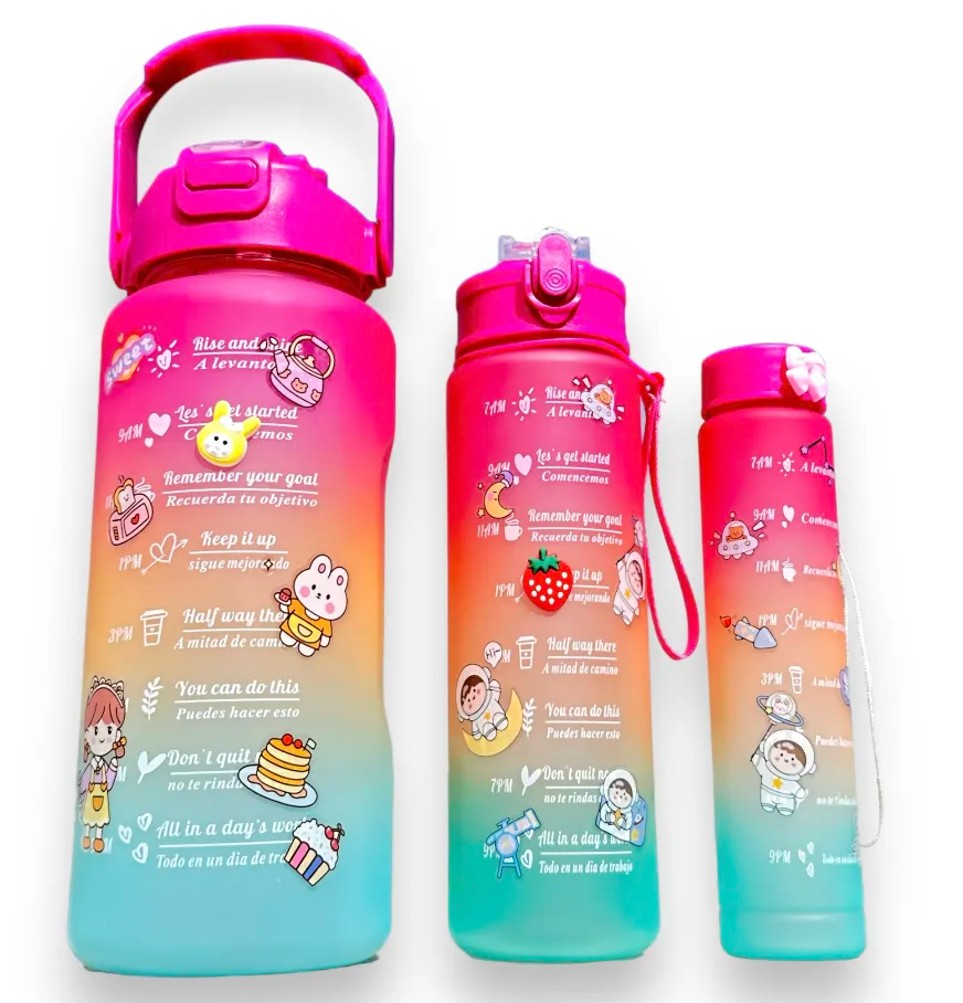 Chegou a hora de investir em saúde e bem-estar! Adquira agora mesmo a Garrafa de Água Motivacional e faça parte do movimento de pessoas que estão alcançando seus objetivos. Escolha o kit e a cor ideal para você e sua família ou você pode escolher apenas 1 squeeze.