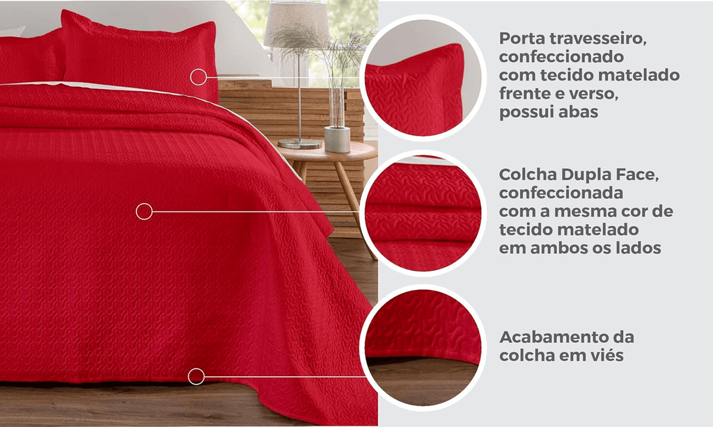 Complete o visual da sua Cama de Casal com o Kit Colcha de Cama Vermelho Carpentino. Este kit não apenas aprimora a estética do quarto, mas também melhora a qualidade do seu descanso, proporcionando uma cama mais convidativa e confortável.