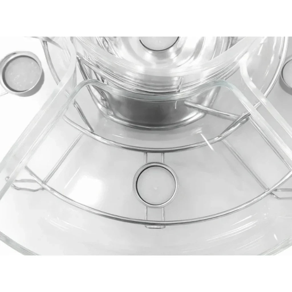 🔶Suporte robusto em aço inox + tigelas de vidro borossilicato, resistentes ao calor e fáceis de limpar.
