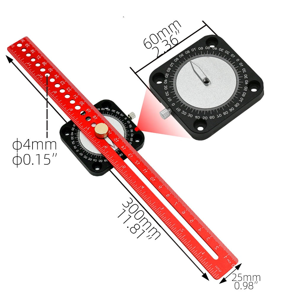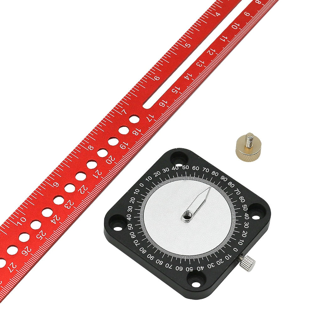 Material: Corpo da liga de alumínio + régua da liga de alumínio (anodizado) Funções: Linha paralela, linha vertical, linha transversal, círculo de desenho, calibre de ângulo