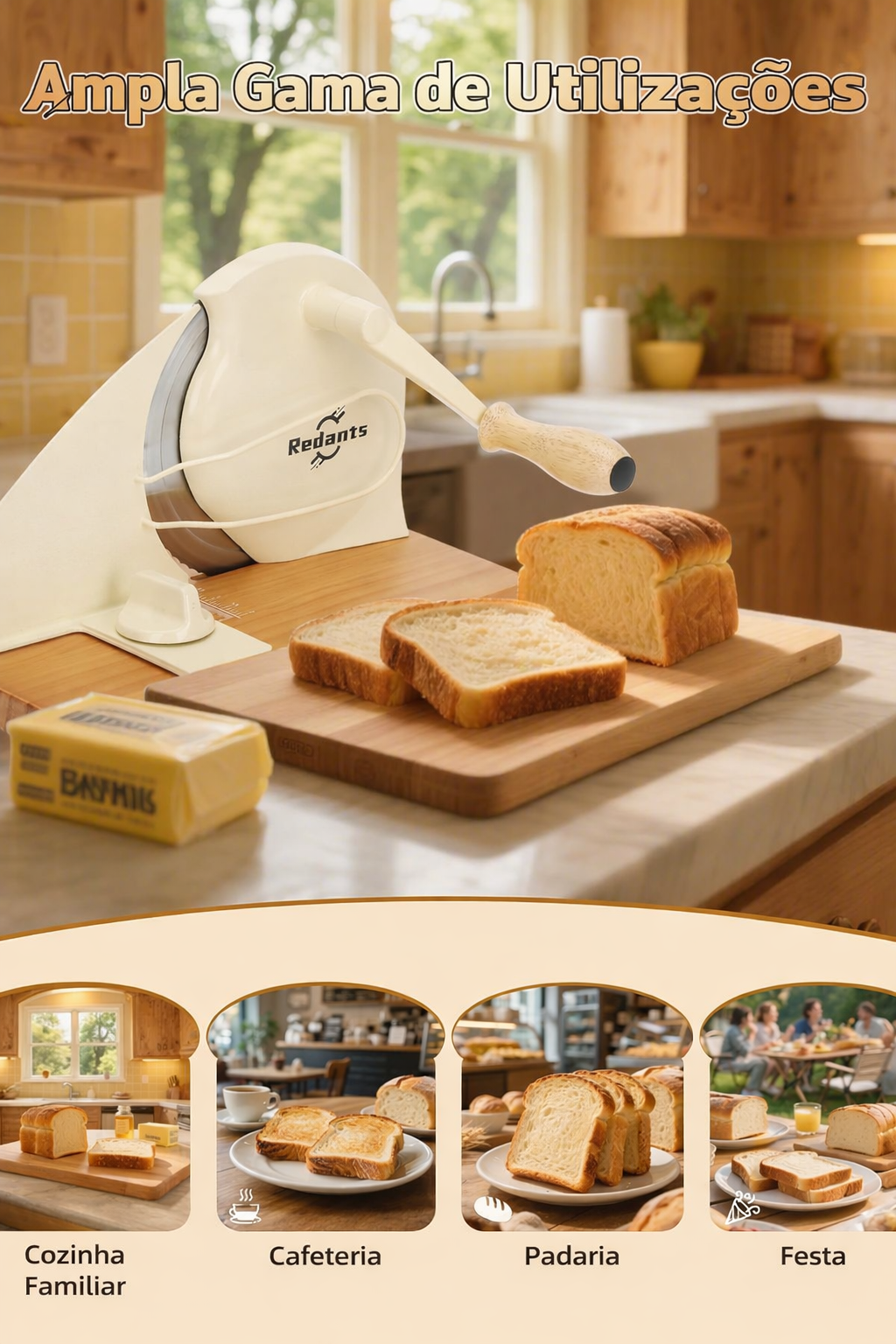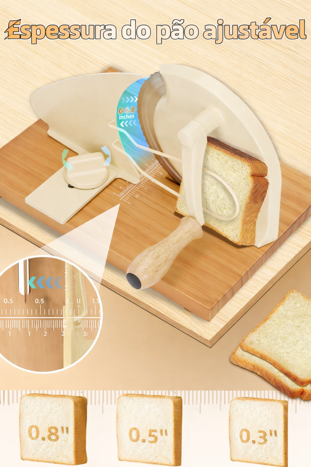 - Acabamento Premium: A base desta fatiadora de pão manual possui ventosas de alta resistência que a fixam firmemente na bancada, tornando o uso mais suave e eficiente. Fabricada em madeira maciça de alta qualidade, é robusta e durável.